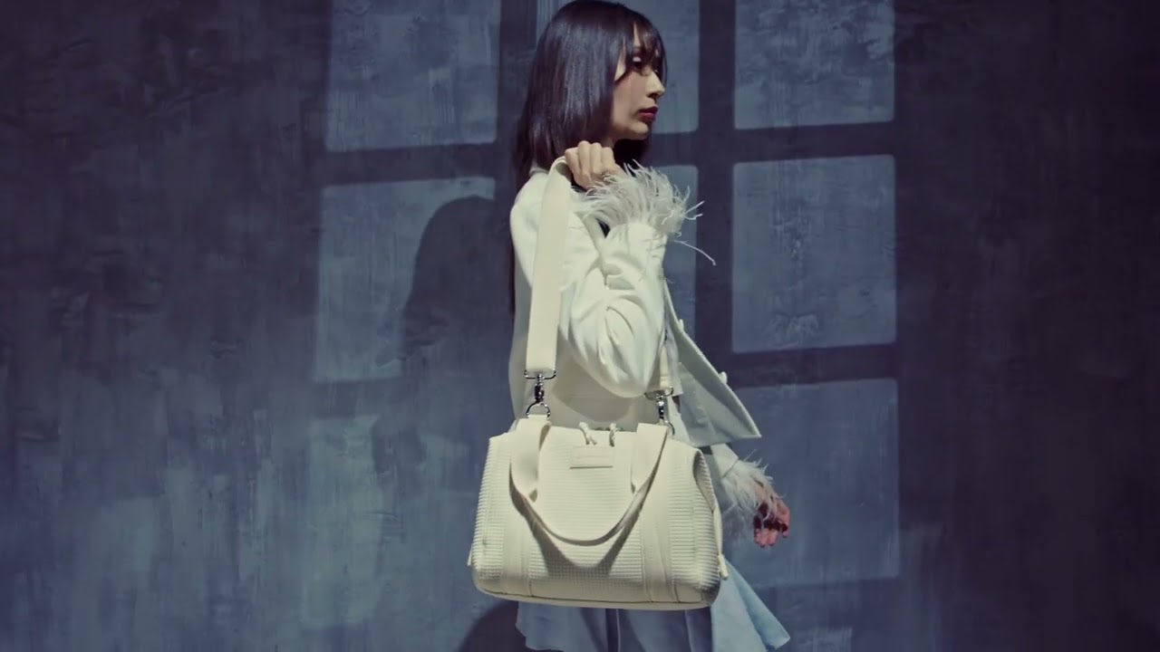 Está fabricada en neopreno repelente al agua, con una textura suave de cuadros que aporta un look contemporáneo y sofisticado. Incorpora asas cortas ajustables para llevarla cómodamente como bolso de mano y una correa larga removible, que te permite usarla al hombro según tu preferencia.